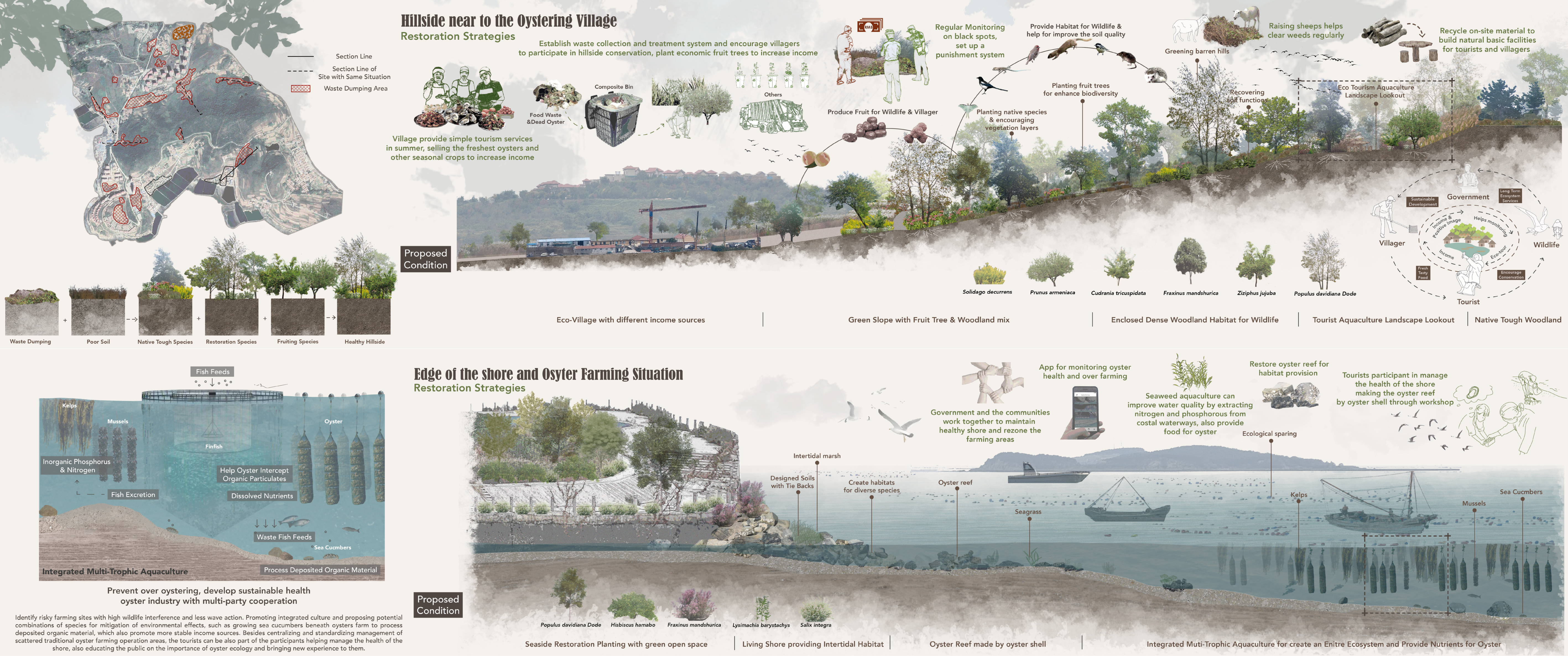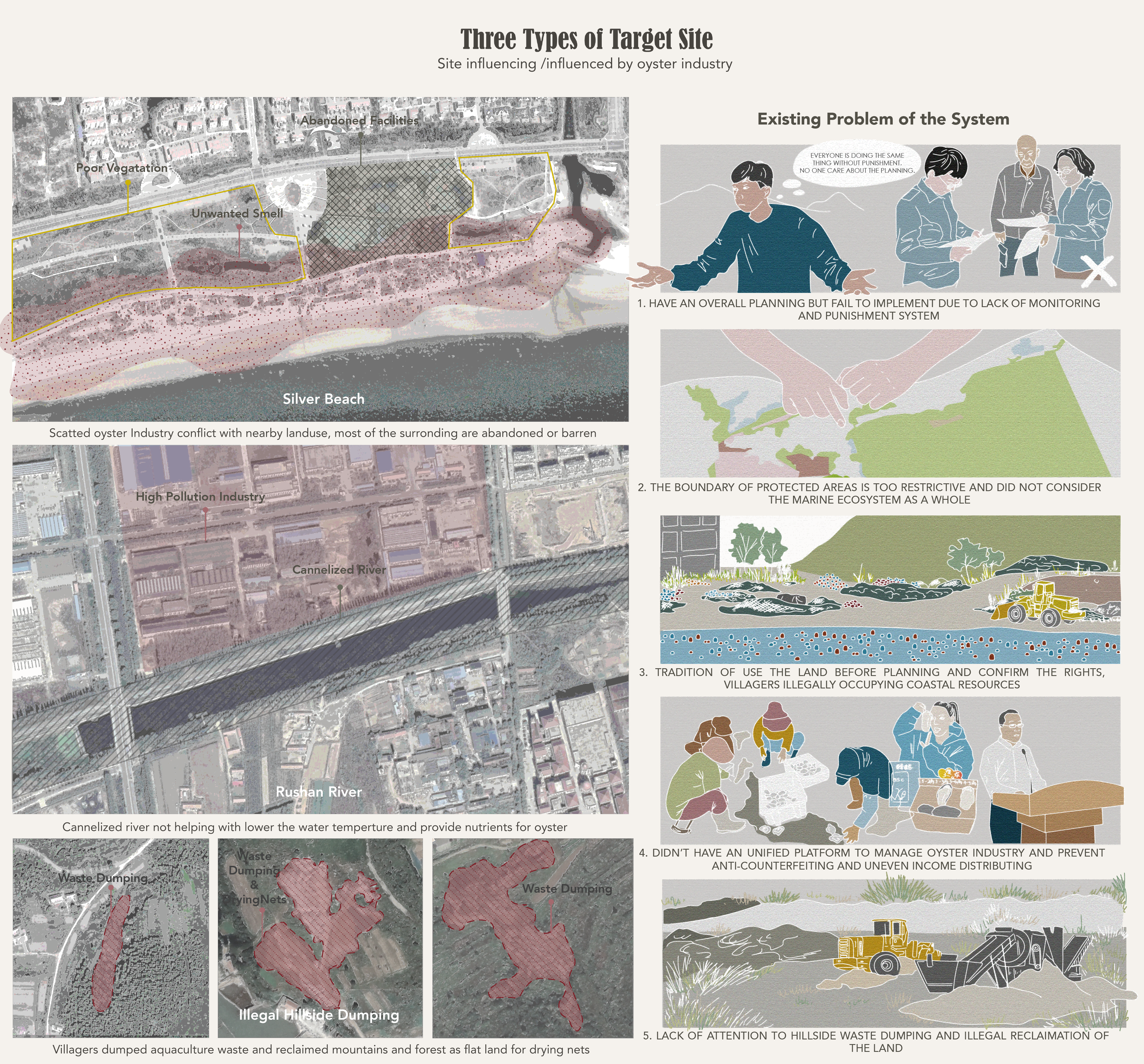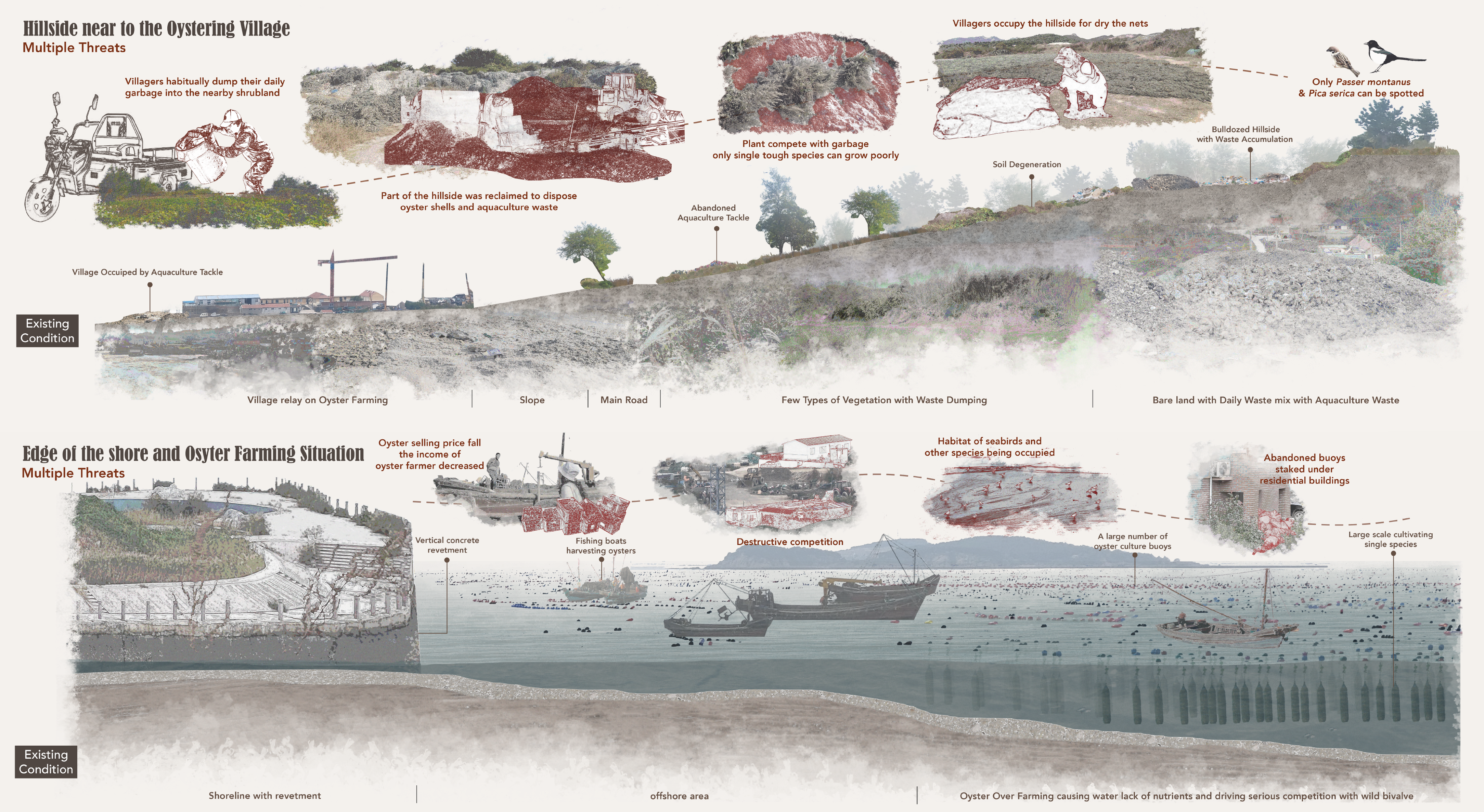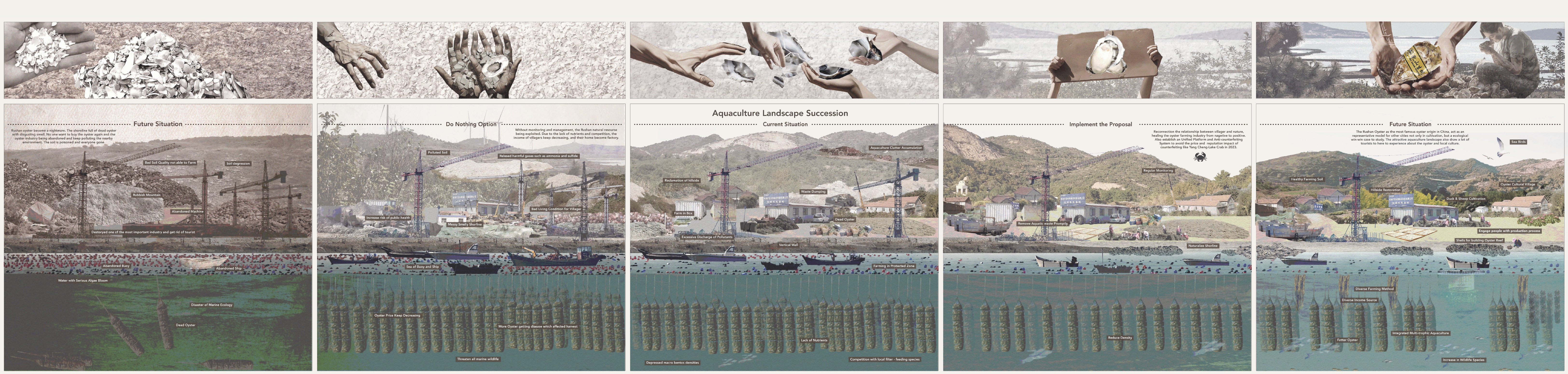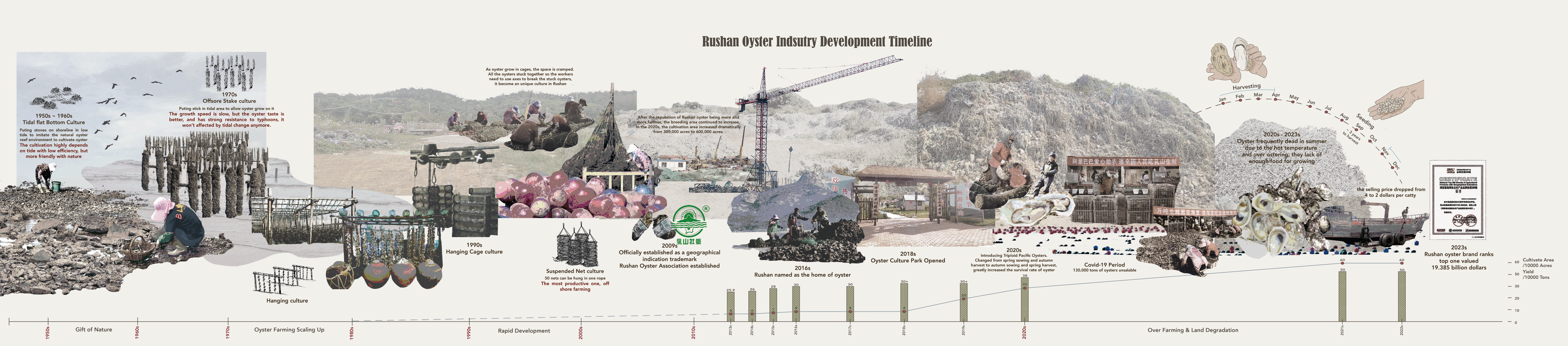 As the most important industry in Rushan, it needs to develop in a more sustainable way and construct a symbiotic relationship with nature before the irreparable crisis happens. This project aims to prevent the scenario of over-oystering and develop the innovative culture value of oysters. Trying to reposition the relationship between human and nature, transforming the stress to biophilia scenes.
